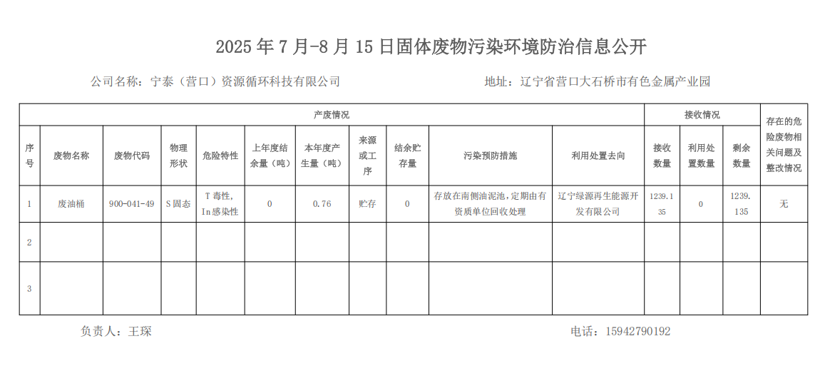 2025 年 7 月-8 月 15 日固体废物污染环境防治信息公开